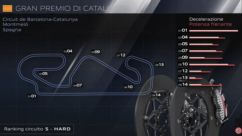 Le virage le plus exigeant du Circuit de Barcelona-Catalunya pour le système de freinage est le virage 1 : les motos MotoGP décélèrent de 338 km/h à 100 km/h en 4,6 secondes, parcourant 257 mètres, tandis que les pilotes exercent une charge de 6,7 kg sur le levier de frein. La décélération atteint 1,5 g, la pression du liquide de frein Brembo atteint 14,4 bars et la température des disques en carbone grimpe à 700 °C.
