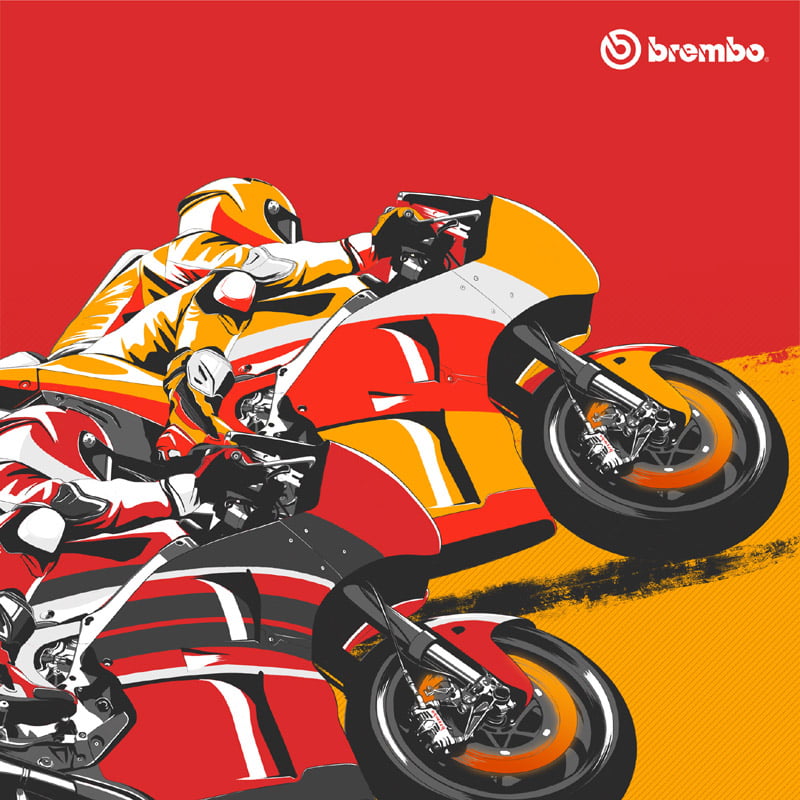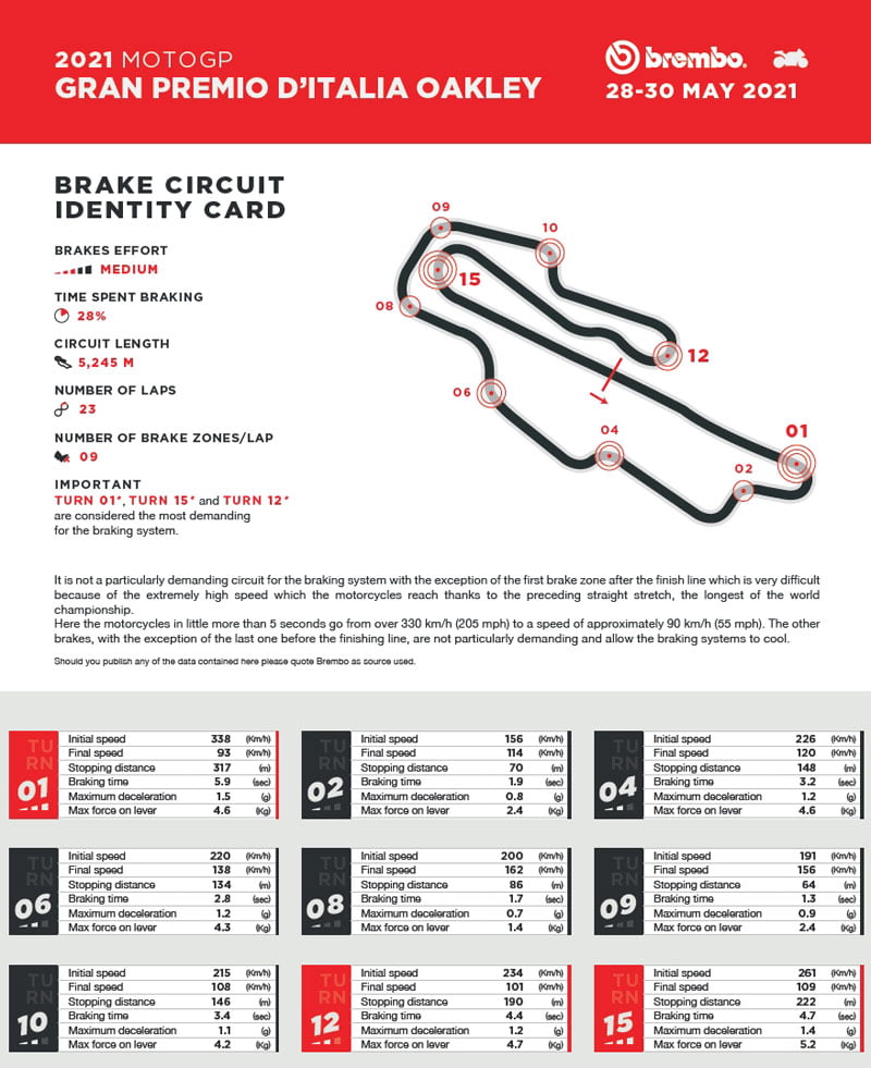 Le freinage le plus exigeant pour le MotoGP est celui du premier virage : Les motos passent de plus de 330 km/h à 99 km/h en seulement 5 secondes et couvrent une distance de 269 mètres. Pour ce faire, les pilotes appliquent une charge de 5,4 kg sur le levier de frein et sont soumis à une décélération de 1,5 G, tandis que la pression du liquide de frein s’élève à 11,6 bars.
