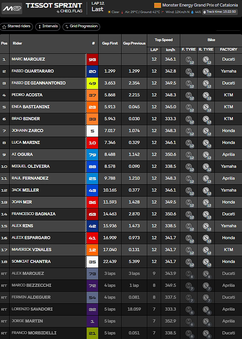 Résultats de la course sprint du Grand Prix de Catalogne :