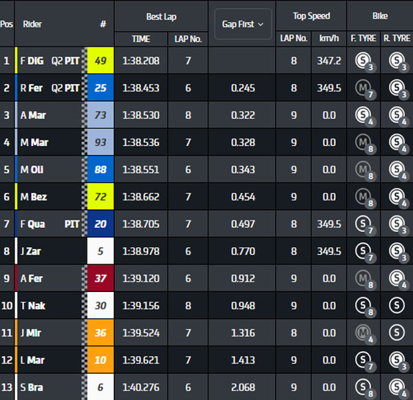 Le temps de référence est signé par MMarquez en 1.39.142s. Quartararo est le 2ème plus rapide en 1.39.212s.