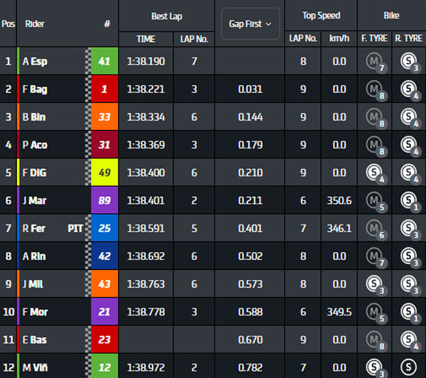 Acosta passe en tête en 1.38.369s. Il est pris par Bagnaia en 1.38.221s