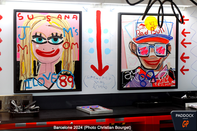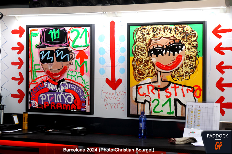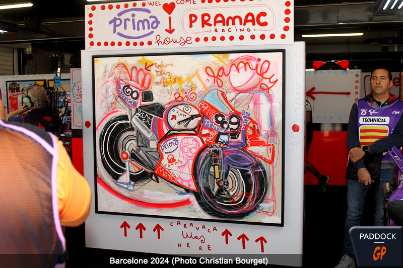 Sur le circuit de Barcelona-Catalunya, le team Pramac a dévoilé une décoration aussi éphémère que sympathique, grâce à une collaboration avec l’artiste espagnol Miguel Caravaca. L’homme est connu pour ses oeuvres peintes à la bombe aérosol, au feutres et aux pinceaux, à mi-chemin entre Picasso et le street art. Il avait déjà à son actif des oeuvres de renommée, comme la décoration de l’hôtel Hilton Montera à Madrid ou la boutique de montres suisses IWC dans la même ville.