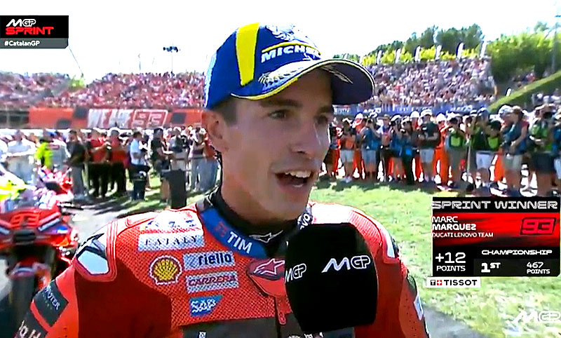 A peine descendu de sa Ducati GP25 du team d’usine Ducati Lenovo après avoir remporté le Sprint du Grand Prix de Catalogne MotoGP 2025 à Barcelone, Marc Marquez s’est confié devant les caméras du site officiel MotoGP.com avec la joie inespérée de remporter son 14e Sprint de la saison…