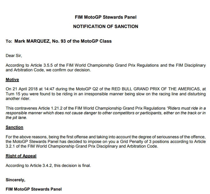 Mais sans doute est-ce l’effet de la Commission de sécurité durant laquelle il a été décidé hier de demander au commissaire d’être plus sévères, toujours est-il que, selon nos sources, Marc Márquez a été pénalisé de 3 places après avoir été entendu par les commissaires de la FIM, et ainsi rétrogradé à la 4e position sur la grille du départ du Grand Prix des Amériques.