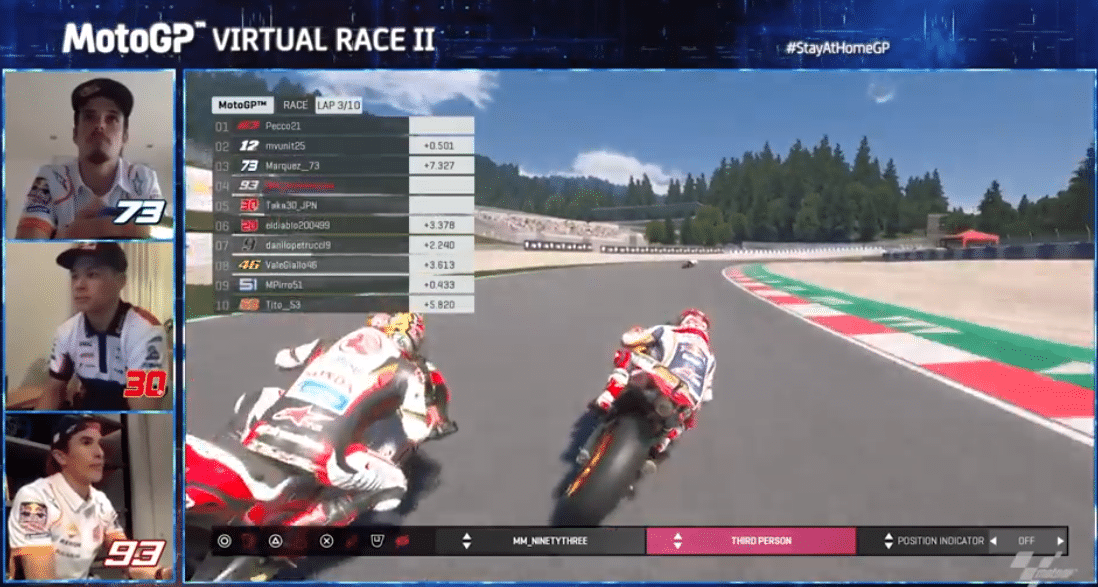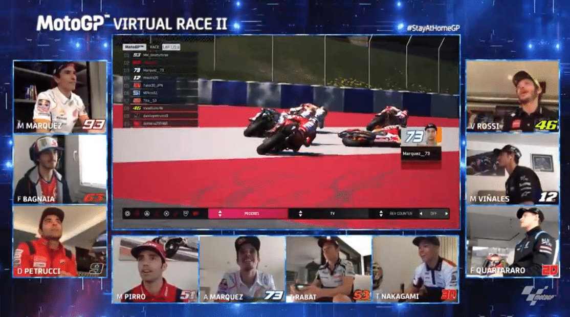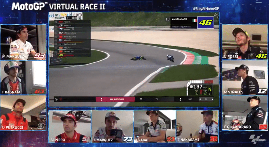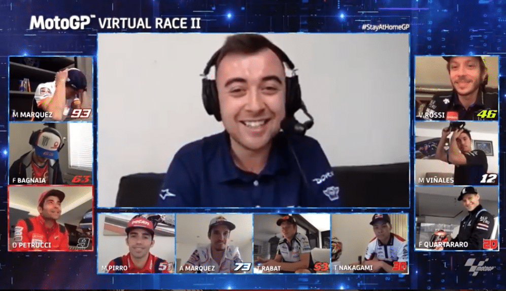 Et non des moindres puisque Valentino Rossi entre en scène aux côtés de son équipier Maverick Viñales lui aussi aguerri depuis le 29 mars au Mugello. Nakagami et Rabat débarquent comme les deux pilotes officiels Ducati que sont Petrucci et Pirro. Chacun avoue s’être entraîné et même avec des spécialistes de l’eSport. On prend donc les choses au sérieux !
