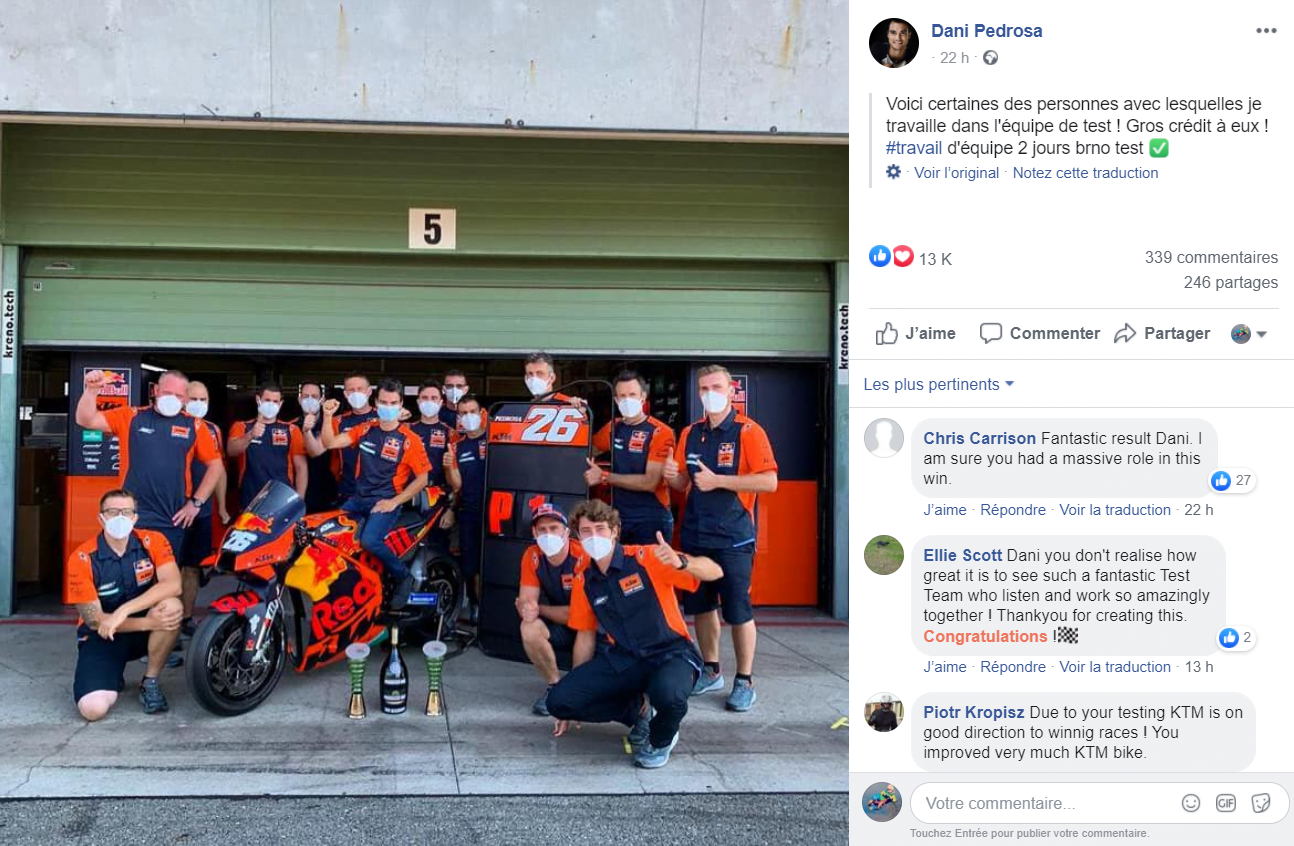 C’est ainsi qu’il les a félicités avec un message sur les réseaux sociaux. La KTM s’est considérablement développée depuis que l’ancien pilote Honda a été embauché comme testeur. A tel point que personne ne doute que lors des deux prochaines courses sur le Red Bull Ring, prévues les 16 et 23 août, le constructeur autrichien pourrait être un grand protagoniste.