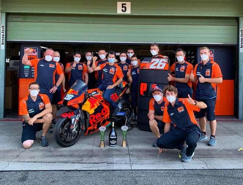 Dani Pedrosa est un pilote test KTM depuis maintenant un peu plus d’un an, et il se dépense sans compter pour faire évoluer le projet RC16. Une moto qui a concrétisé contre toute attente le week-end dernier à Brno avec un étincelant Brad Binder qui est peut-être la révélation de cette saison. Les décideurs de la marque n’ont pas oublié la contribution du triple Champion du Monde dans ce résultat historique. Alors le même vétéran a décidé de ne pas oublier son équipe test dans cette liesse qui transporte les couleurs orange sur leurs terres du Red Bull Ring ce week-end…
