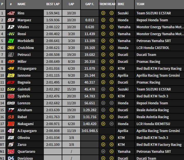 Voilà pour les statistiques. Mais pour ce qui est du stand Suzuki, son team manager vivait intensément l’instant présent. Davide Brivio était en effet extatique au moment de faire le bilan de cette bataille d’Angleterre : « Quelle victoire ! ». Et il a avoué : « j’ai toujours espéré avoir un tel duel, en particulier avec Marc Márquez ».