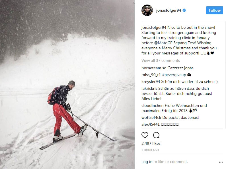 Le pilote Tech3 s’est chargé lui-même de rassurer ses fans par le biais d’une photo et du message sur Instagram : « C’est bon d’être dehors dans la neige! Je commence à me sentir plus fort et j’ai hâte d’aller à ma clinique d’entraînement en janvier avant les tests MotoGP de Sepang! Je souhaite à tous un Joyeux Noël et merci pour tous vos messages de soutien ! »