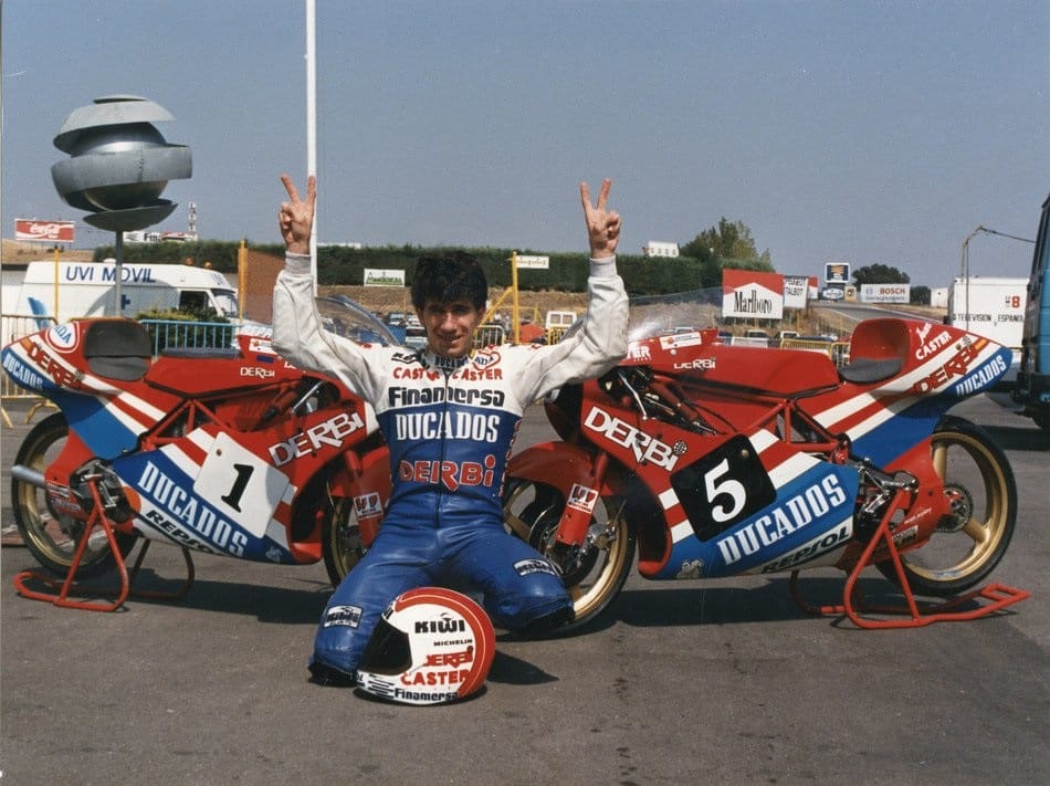 Comme Dörflinger, Jorge Martinez, surnommé Aspar, a remporté quatre titres mondiaux. Dans la catégorie 80cc, Martinez fut même le successeur direct de Dörflinger en tant que champion, remportant le championnat de 1986 à 1988 trois fois de suite. En 1988, le pilote ibérique fait coup double, empochant en prime le titre de Champion du Monde 125cc, avec pas moins de neuf victoires au compteur… sur 11 courses disputées à l’époque. Cet Espagnol, aujourd’hui patron de team, aura finalement couru à travers les catégories 50cc, 80cc, 125cc et 250cc. Actif jusqu’en 1997, il aura cumulé l’équivalent de 37 succès.