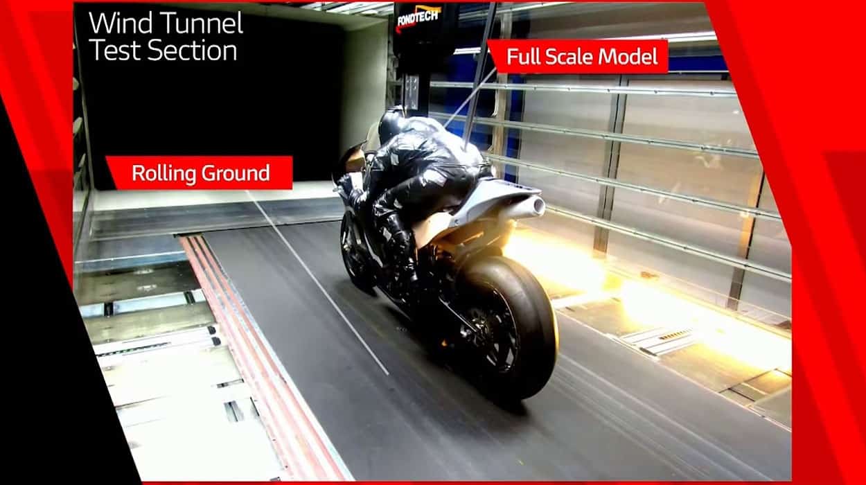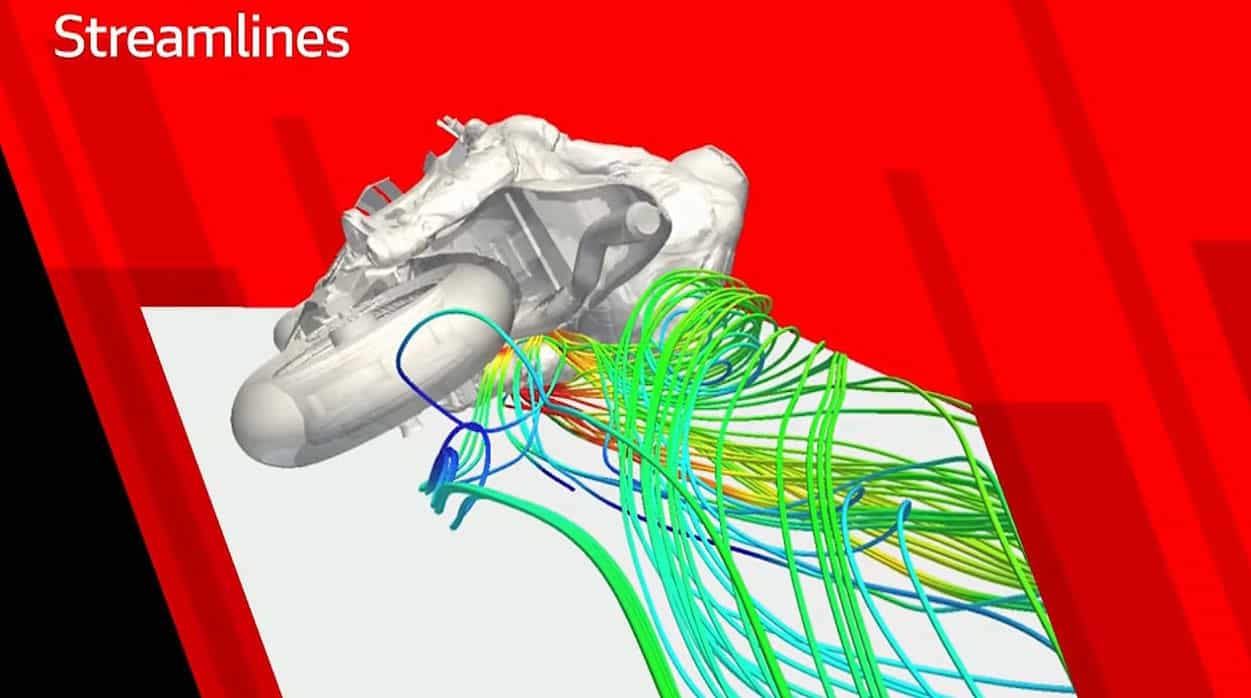 « Par exemple, nous avons introduit l’utilisation massive de la CFD, qui est Computational Fluid Dynamics, c’est-à-dire la simulation mathématique de ce qui se passe autour de la moto en termes d’aérodynamique. Dans le passé, nous développions les motos en soufflerie, donc nous utilisions donc une maquette grandeur nature, composée de composants existants, de pièces détachées de motos existantes par exemple.