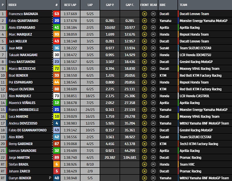A 19 tours du but, Bagnaia tient en respect Quartararo à 1/2s : Miller, Marc Marquez, Aleix Espargaro, Mir, Nakagami, Bezzecchi, Zarco et Binder ferment la marche de ce top10
