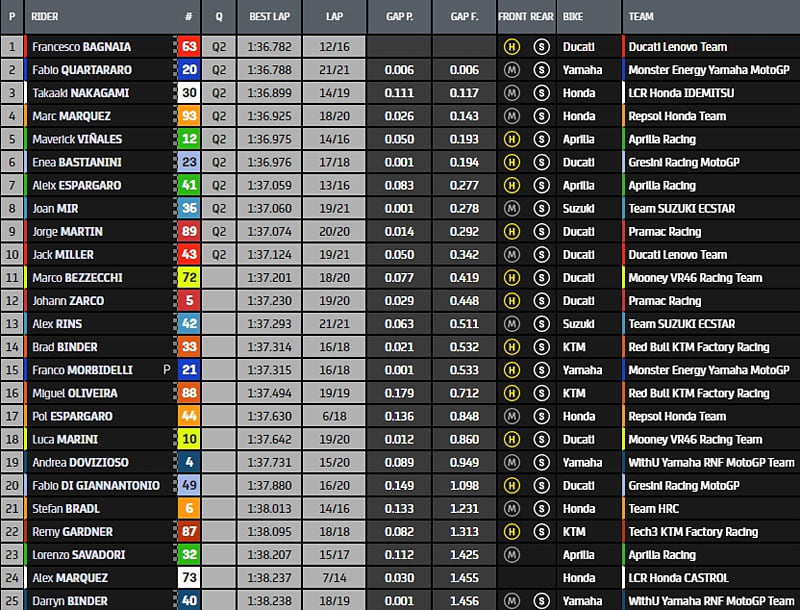 Au final, Francesco Bagnaia, Fabio Quartararo, Takaaki Nakagami, Marc Márquez, Maverick Vinales, Enea Bastianini, Aleix Espargaro, Joan Mir, Jorge Martin et Jack Miller sont donc préqualifiés pour la Q2.