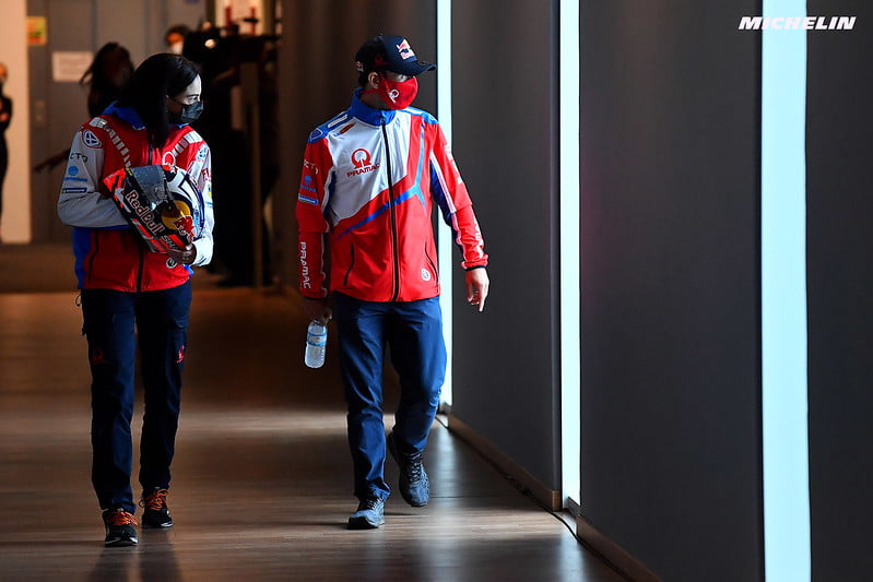 « Positif et concentré à continuer à bosser un peu sur le pilotage pour vraiment gérer ces virages lents. Ce n’est pas le problème de la Ducati, c’est juste un problème de confiance et de bon pilotage. Ce qui me motive, c’est Bagnaia qui dans ce genre de petits virages est très confiant et fait la différence. C’est signe que la Ducat en est capable, et ça me motive beaucoup parce que ça t’enlève plein de doutes de la tête, et ça permet de travailler que sur soit. Plus facile à dire qu’à faire mais ça enlève quand même beaucoup de questionnements. Donc voilà, esprit disons travailleur concentré pour continuer à avancer dans le championnat. Il ne faut pas oublier que je suis toujours en mesure de le jouer et la saison est longue. Sur un circuit peut-être théoriquement plus difficile pour nous, ce qu’on prendra sera très bon à prendre, et mieux on le prendra, mieux ce sera pour les circuits qui arrivent. »