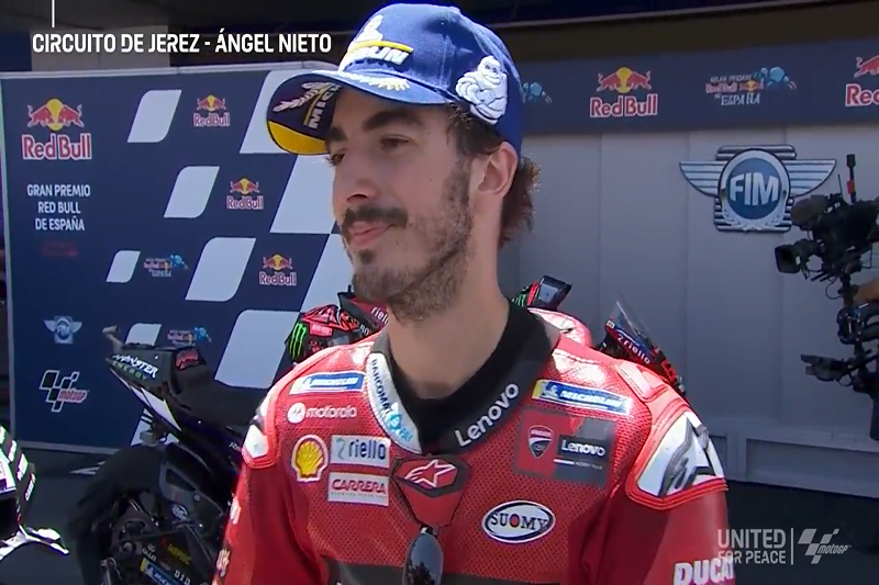 A peine descendu de sa machine après avoir obtenu la pole position à l’issue des qualifications du Grand Prix d’Espagne, Pecco Bagnaia s’est confié devant la caméra du site officiel MotoGP.com.