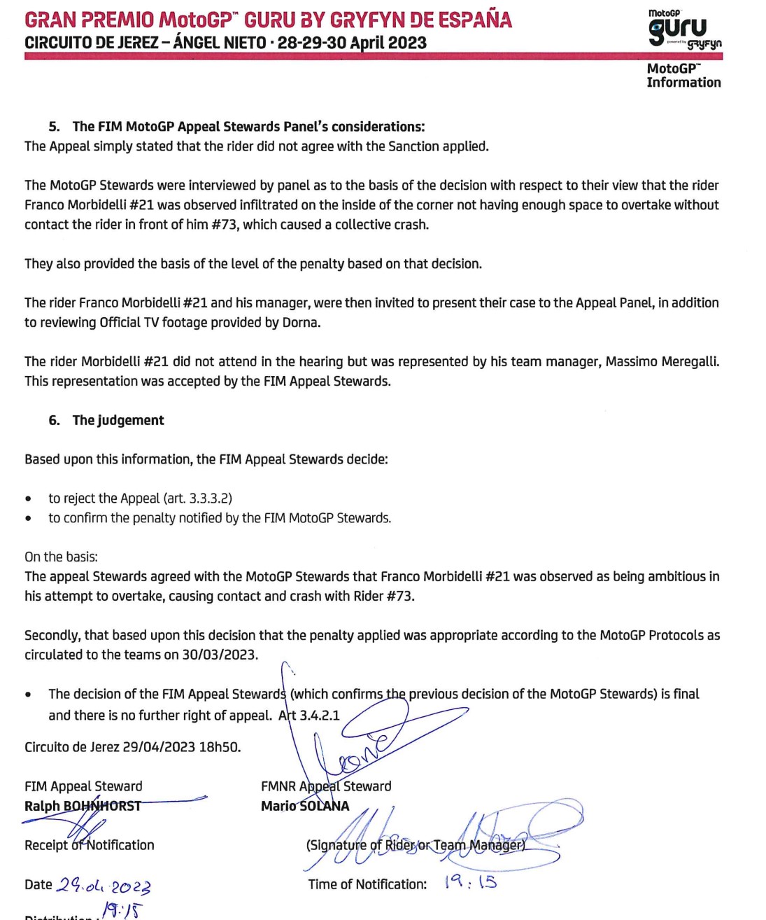 Mais Morbidelli a compris que tous ces commentaires étaient pour lui. Alors il a répondu : « j’ai vu un écart et j’ai voulu prendre mon virage bien serré. Je ne voulais pas le dépasser. Je ne sais pas s’il ne m’a pas vu, mais il a coupé la ligne et nous nous sommes touchés et sommes tombés. C’est si serré. Chaque position compte tellement. Si vous gagnez une position, vous la conservez probablement pendant toute la course car les dépassements sont devenus si difficiles », note Morbidelli. « C’est le résultat. Les pilotes risquent, risquent et risquent beaucoup ». Certes, mais une pénalité de long lap à effectuer dimanche a été prononcée contre l’italo-brésilien. Dans cette procédure, Yamaha avait fait appel, un appel qui a été rejeté.