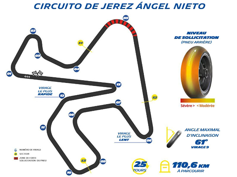Véritable théâtre de la compétition moto au plus haut niveau, Jerez attire chaque saison une foule nombreuse et passionnée, dans une ambiance unique. Avec un développement de 4,423 kilomètres, le Circuit de Jerez se distingue par un tracé à la fois technique et sinueux. Il comprend treize virages – cinq à gauche et huit à droite – ainsi que deux lignes droites relativement courtes, la plus longue dépassant tout juste 600 mètres.