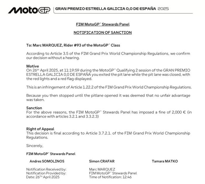 Un précédent existait : en Thaïlande l’année dernière, Ai Ogura avait été pris dans une situation similaire, écopant d’une amende de 500 dollars. Cette fois, la Direction de Course a décidé un autre tarif : 2 000 euros d’amende pour chacun des frères Marquez et l’annulation du premier tour chrono d’Alex après l’infraction.