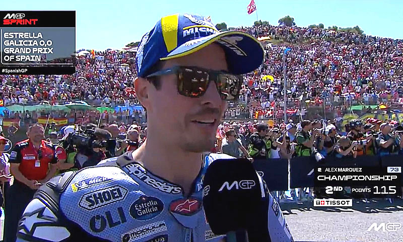 A peine descendu de sa Ducati GP24 du team Gresini après avoir terminé 2e du Sprint du Grand Prix d’Espagne MotoGP 2025 sur le circuit de Jerez, Alex Marquez s’est confié devant les caméras du site officiel MotoGP.com en justifiant une fois de plus son surnom de « Mister P2 » …