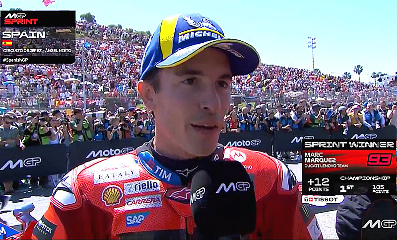 A peine descendu de sa Ducati GP25 du team d’usine Ducati Lenovo après avoir remporté le Sprint du Grand Prix d’Espagne MotoGP 2025 sur le circuit de Jerez, Marc Marquez s’est confié devant les caméras du site officiel MotoGP.com avec un petit secret à la clef…