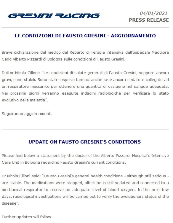 Le docteur Nicola Cilloni a déclaré : « L’état de santé général de Fausto Gresini – bien que toujours grave – est stable. Les médicaments ont été arrêtés, bien qu’il soit toujours sous sédatif et relié à un respirateur mécanique pour recevoir un niveau adéquat d’oxygène sanguin. Dans les prochains jours, des examens radiologiques seront effectués pour vérifier l’évolution de la maladie. »