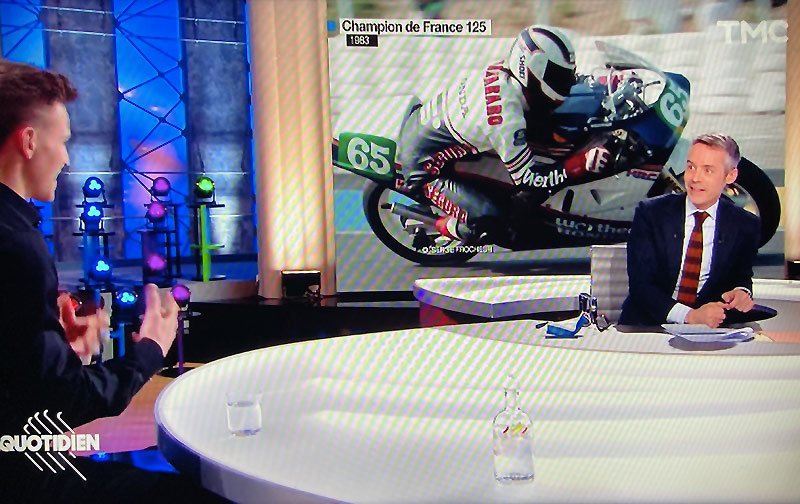 La rencontre entre les deux mondes a eu lieu mercredi dernier, pendant neuf minutes, lorsque El Diablo, tout de noir vêtu, a fait son apparition sur le plateau de l’émission « Quotidien » diffusée chaque soir sur TMC, du lundi au vendredi à partir de 19h25. Les passionnés des deux roues ont dû attendre la deuxième partie du talk show, après plus d’une heure d’émission, pour entendre le pilote Yamaha, petit effort largement compensé et récompensé par une notoriété croissante de notre passion auprès du très grand public.