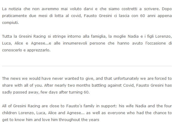 Tous les membres de Gresini Racing sont proches de la famille de Fausto pour la soutenir : sa femme Nadia et ses quatre enfants Lorenzo, Luca, Alice et Agnese… ainsi que tous ceux qui ont eu la chance de le connaître et de l’aimer au fil des ans.