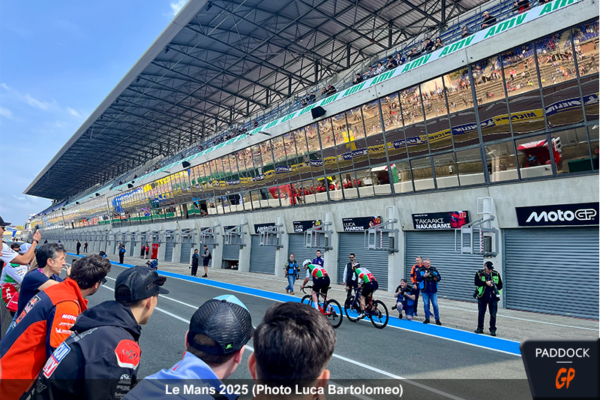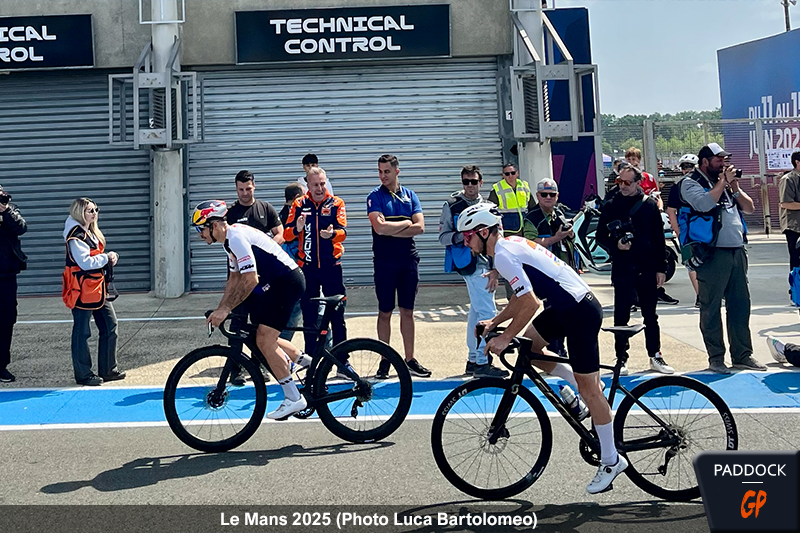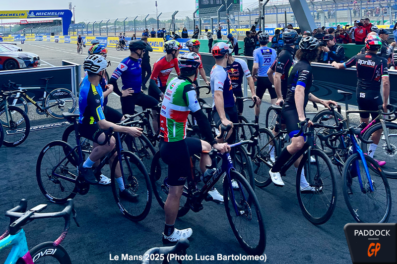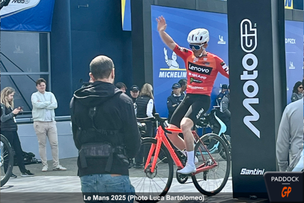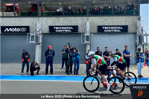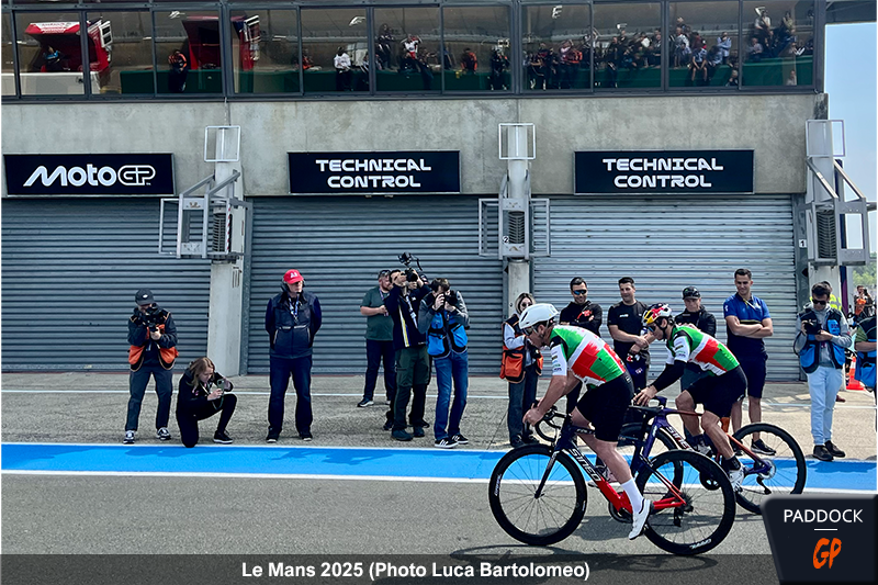 À l’occasion du Grand Prix de France de MotoGP, la première course du week-end eut lieu le jeudi ! Pour rendre hommage au sport français, et à son célèbre Tour de France, Claude Michy et les organisateurs de l’événement ont pris l’initiative d’organiser ‘Le Tour MotoGP’, une course cycliste entre pilotes autour du Circuit Bugatti du Mans.