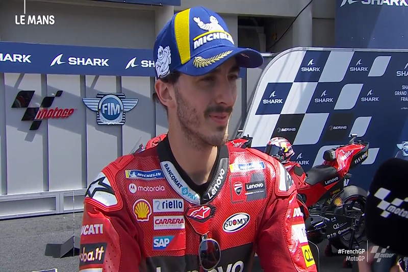 A peine descendu de sa machine après avoir obtenu la pole position à l’issue des qualifications du Grand Prix de France, Pecco Bagnaia s’est confié devant la caméra du site officiel MotoGP.com.