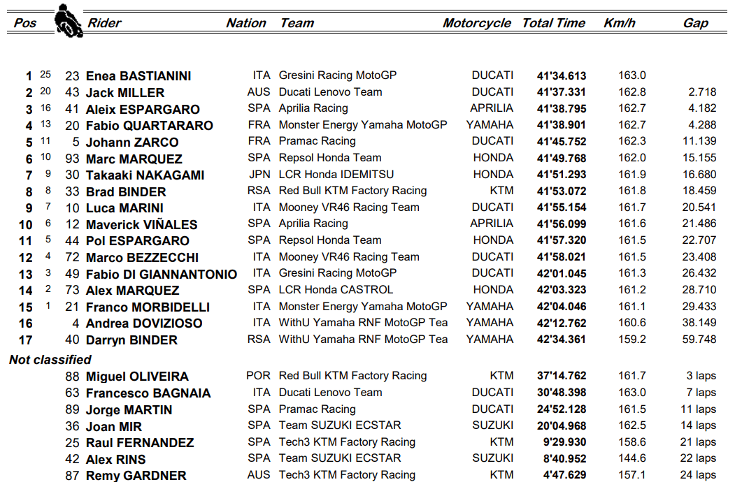 « Je pense qu’aujourd’hui on a été forts au niveau de la traction car j’ai été très conservateur au niveau des freins. Je ne voulais faire aucune erreur dans la perspective du championnat avec Fabio. Freiner fort en entrée de virage m’a permis de relever davantage la moto dans le virage et donc de bénéficier de plus de grip. Je pense cependant que le bon côté de l’Aprilia ne réside pas dans sa traction ou dans les phases de freinage, mais au niveau de son équilibre. Elle est performante dans plus ou moins tous les secteurs, et aujourd’hui ce fut la première fois où j’ai souffert au niveau de l’accélération. La traction n’était pas si mauvaise, mais avec mon accélération c’était tout bonnement impossible pour moi aujourd’hui de me rapprocher de Pecco Bagnaia, Enea Bastianini et de Jack Miller. »