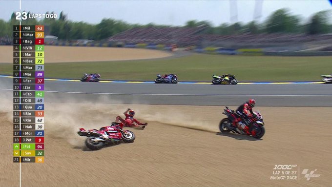Pecco Bagnaia s’accrochait pour rester dans un groupe de tête que Maverick Viñales semblait avoir les moyens de commander au vu de ses chronos à ce stade de la course qui était la 1000è de l’histoire des Grands Prix. L’Aprilia a passé la Ducati qui a voulu répliquer et aucun n’a voulu céder. L’accrochage est arrivé et les deux se sont éliminés.