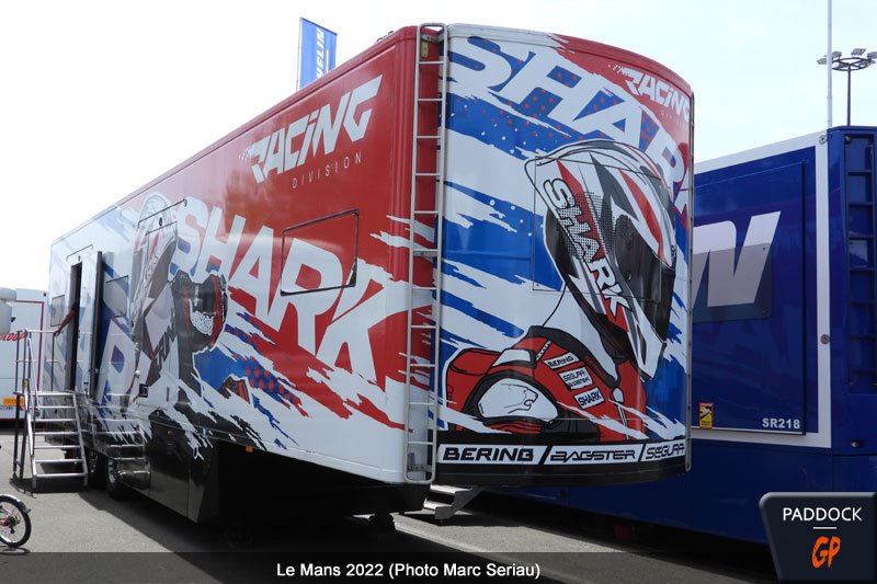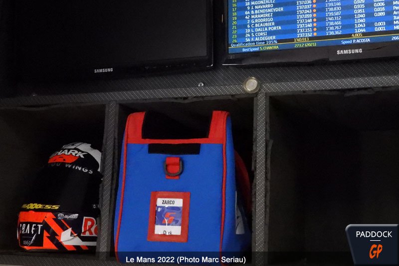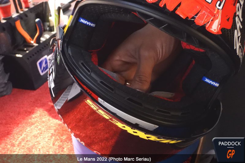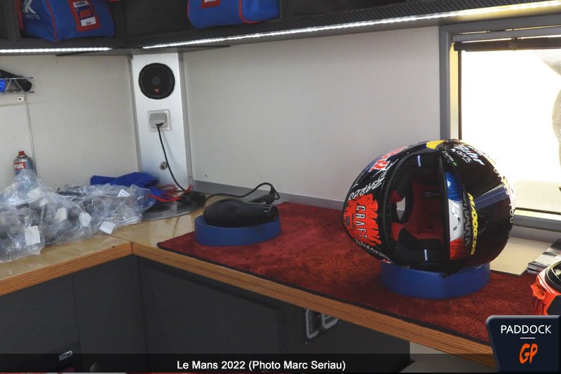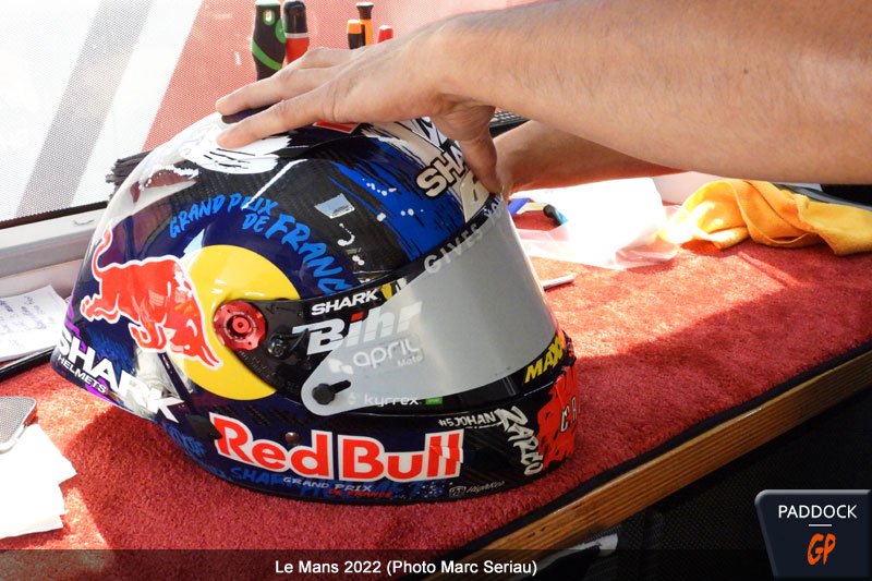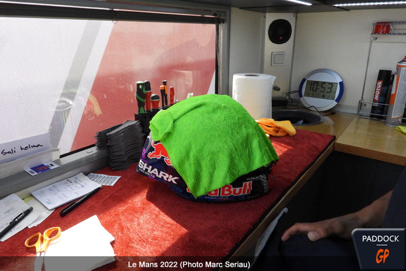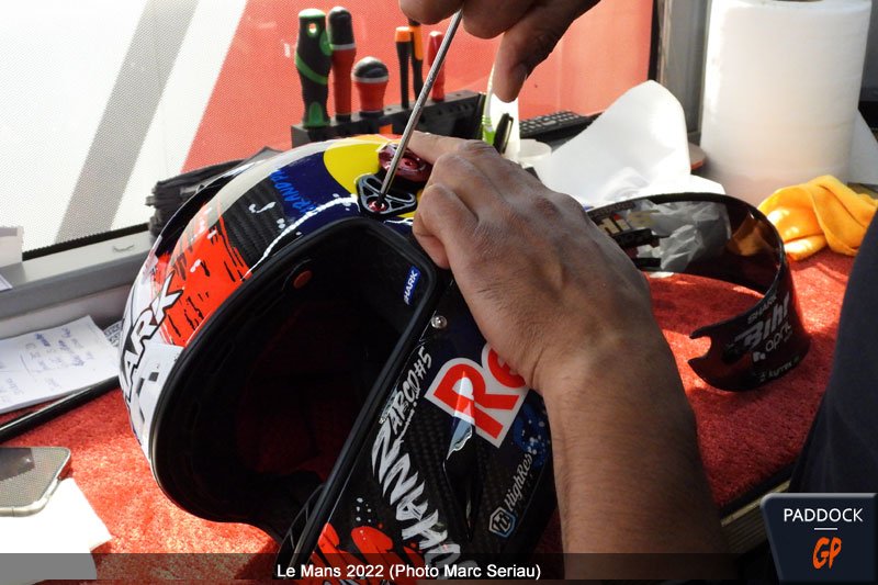 Pendant celui-ci, le casque Shark est rapidement pris en charge pour être amené au Racing Service de la marque française, situé dans le paddock MotoGP.