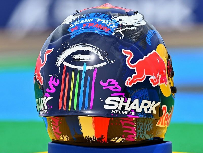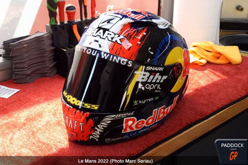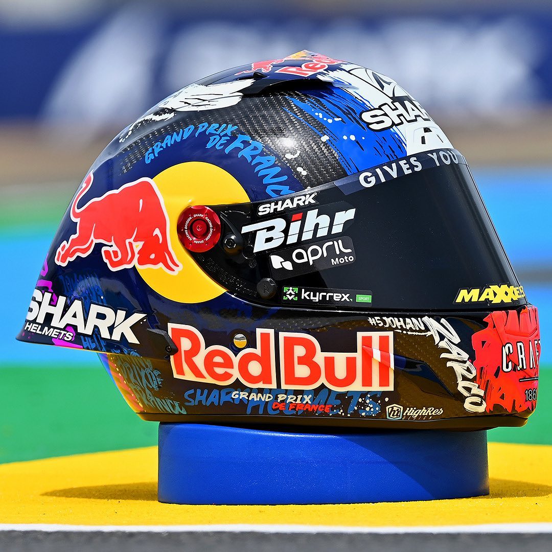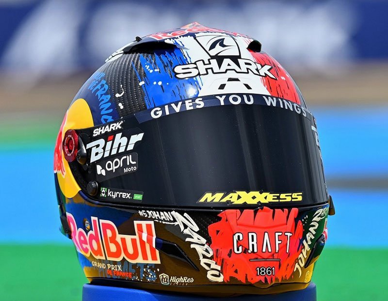 Shark Grand Prix de France oblige, Johann Zarco a tenu à rendre hommage à son épreuve nationale en arborant une décoration personnalisée de son casque Shark Race-R Pro GP FIM Carbone.