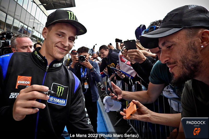 Peu importe, le speaker meuble, la foule scande les prénoms et enfin, au bout de 45 minutes, la magie se produit et les héros apparaissent ! On frôle l’émeute, mais une émeute bon enfant à laquelle les numéros 20 et 5 se prêtent de bon cœur, après deux ans d’absence du public sur le circuit Bugatti. Fabio Quartararo et Johann Zarco ne cachent pas leur plaisir de se sentir autant soutenus pour leur Grand Prix national, dès le jeudi.