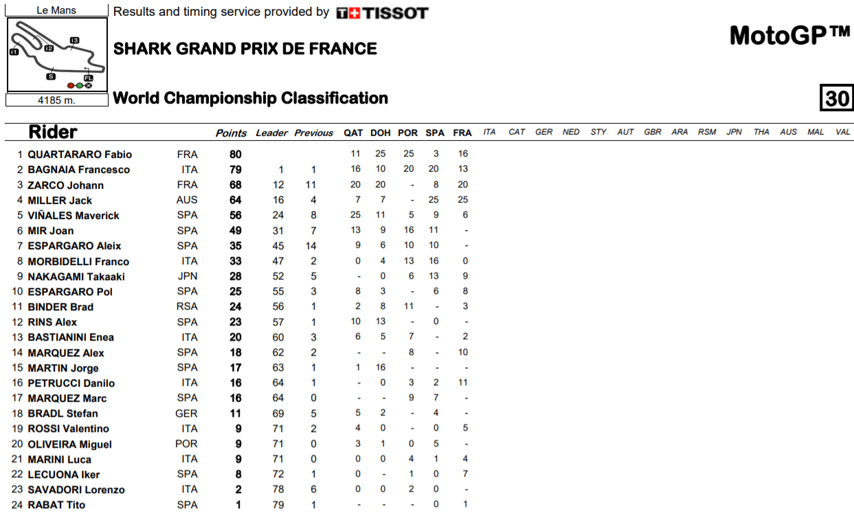 MotoGP France Le Mans Championnat : classement