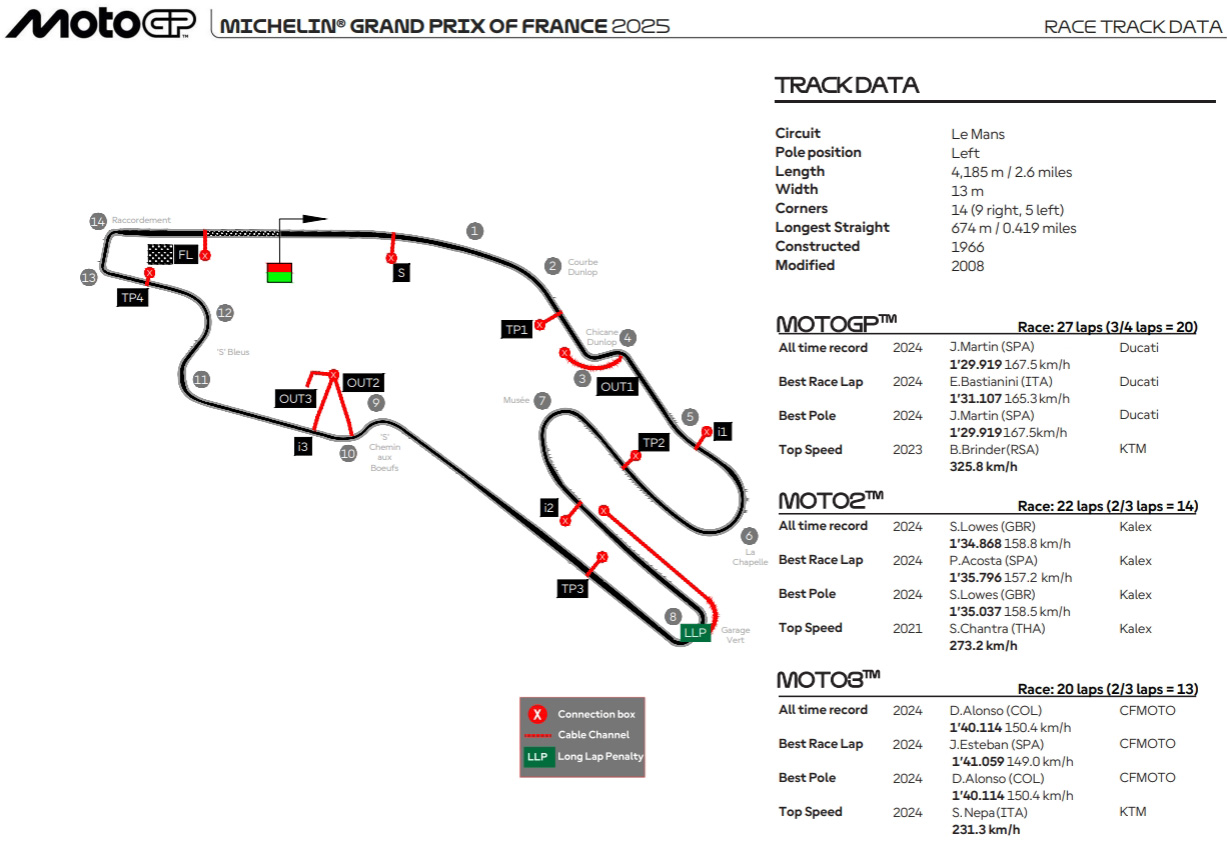 Pour écrire ce sixième chapitre de la saison MotoGP 2025, il faudra parcourir 13 fois le tracé de 4180 mètres lors du Sprint de samedi et effectuer 27 boucles le dimanche.
