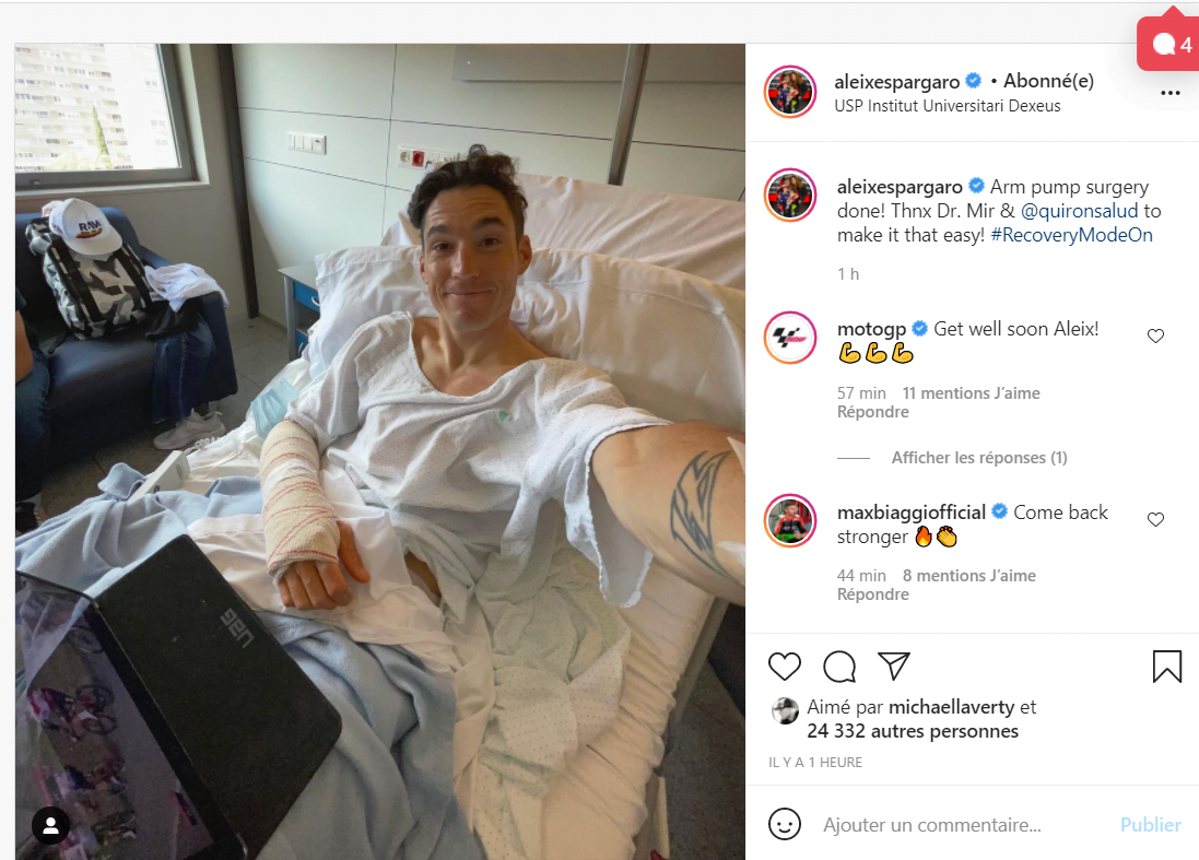 Il est maintenant prévu qu’Aleix Espargaró aille se faire opérer du syndrome des loges. Mais après cette bérézina dans la Sarthe, il se pose des questions : « après ce chiffre zéro, c’est une décision difficile d’avoir une opération maintenant, car cette procédure n’est pas facile. J’ai perdu beaucoup de points ici que je dois rattraper au Mugello. Je dois montrer une course forte là-bas. Il est difficile de dire si je serais plus fort là-bas sans chirurgie peu de temps auparavant. Je crains se souffrir à nouveau après le Mugello. J’ai mes doutes. En même temps, je ne veux pas repousser l’histoire pour toujours. C’est pourquoi j’aurai très probablement une opération ». Le Grand Prix d’Italie est prévue pour le 31 mai. Et Aleix Espargaró s’est fait opérer !