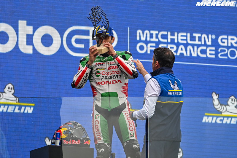Johann Zarco : « C’est très, très spécial et je suis très fier, parce que j’adore l’histoire de la moto. Je connais les grands noms, je regarde souvent les anciennes courses, ça m’a toujours passionné. Et aujourd’hui, écrire cette ligne-là, être un pilote français qui gagne le GP de France, c’est tout simplement magique ! Je me suis toujours poussé, en espérant que je pouvais gagner des courses, monter sur le podium, et j’ai toujours essayé de m’améliorer. Aujourd’hui, j’ai fait ce choix des pneus pluie, et je savais que Jack Miller serait fort dans ces conditions. »