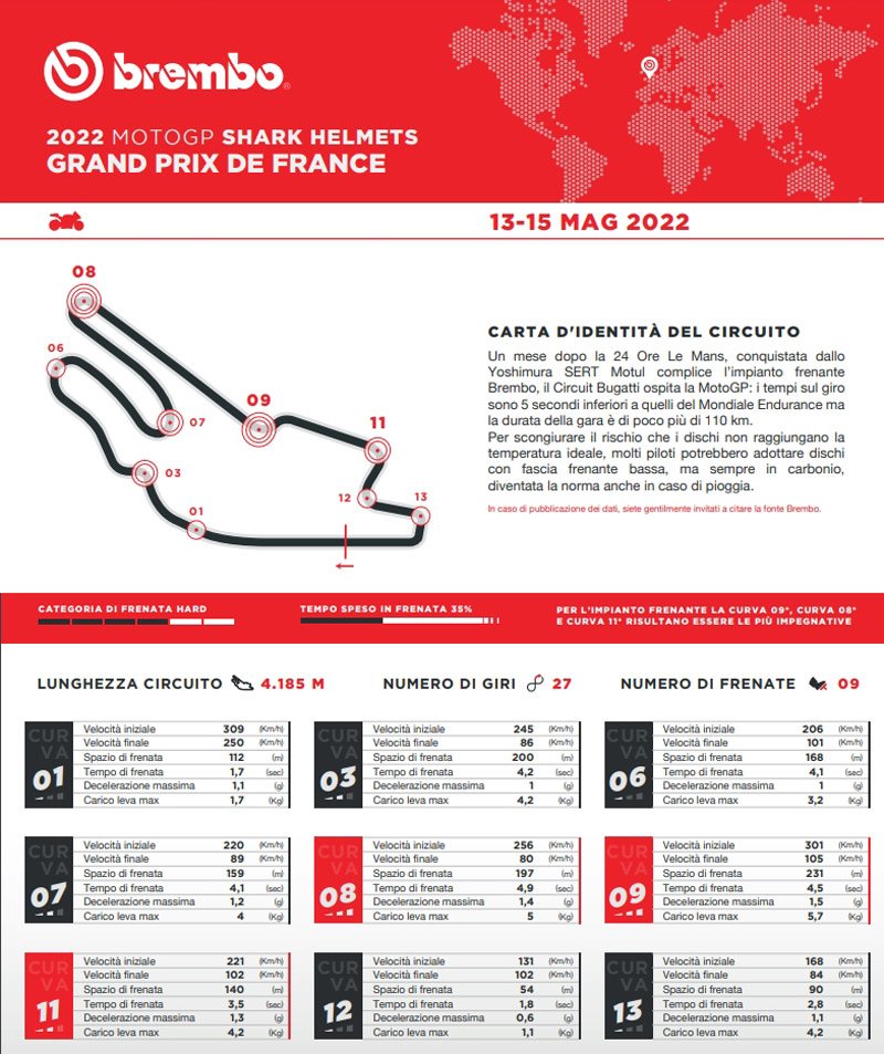 Un mois après les 24 Heures du Mans, remportées par l’équipe Yoshimura SERT Motul avec un système de freinage Brembo, le Circuit Bugatti accueillera le Championnat du Monde MotoGP : les temps au tour sont 5 secondes plus rapides que ceux du Championnat du Monde d’Endurance mais la course couvre seulement une distance d’un peu plus de 110 km.