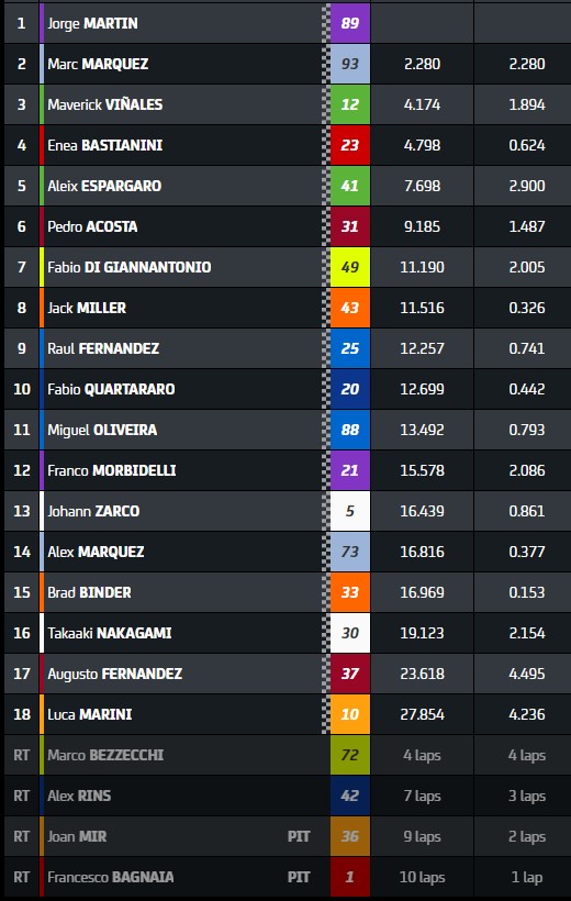 Après 1 tour, le top10 est le suivant : Martin mène devant Bezzecchi, Espargaro, MMarquez, Vinales, Miller, Di Giannantonio, Quartararo, Bastianini et Acosta. Bagnaia 15e, Zarco 13e