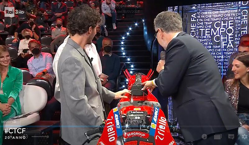 Le pilote officiel Ducati avait apporté sa GP22 en précisant qu’il s’agissait de « la vraie » et qu’elle allait finir dans sa maison. Celle-ci possédait encore son numéro 63 et a été détaillée pour le public. Petite anecdote, interrogé sur la « salad box » par Fabio Fazio, Francesco Bagnaia s’est montré un peu gêné, déclarant : « Là-dedans, il y a un système ultra secret, dont je ne peux pas parler, mais qui aide à mieux piloter. »