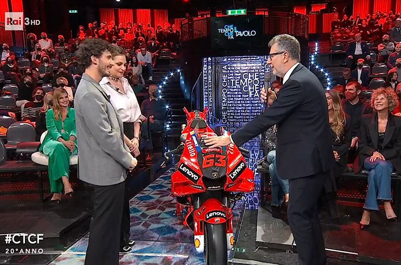 Le pilote officiel Ducati avait apporté sa GP22 en précisant qu’il s’agissait de « la vraie » et qu’elle allait finir dans sa maison. Celle-ci possédait encore son numéro 63 et a été détaillée pour le public. Petite anecdote, interrogé sur la « salad box » par Fabio Fazio, Francesco Bagnaia s’est montré un peu gêné, déclarant : « Là-dedans, il y a un système ultra secret, dont je ne peux pas parler, mais qui aide à mieux piloter. »