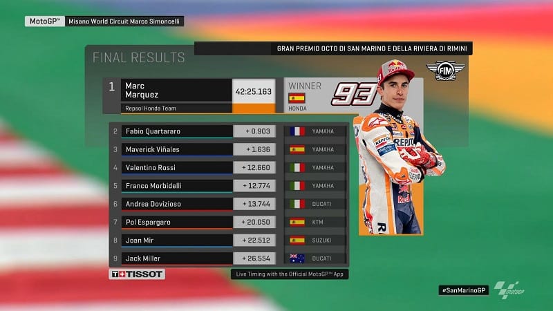 Selon Franco Morbidelli, « C’était une belle et bonne course. C’est mon meilleur résultat de tous les temps ici à Misano entre MotoGP et Moto2 et j’en suis satisfait. Atteindre la cinquième place devant mon public, qui était aussi très nombreux aujourd’hui, est une grande émotion. »