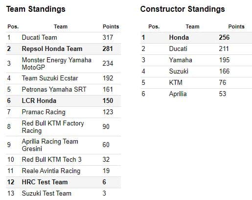 Au Championnat du Monde, Marc est largement en tête avec une avance de 78 points sur son poursuivant immédiat Andrea Dovizioso, alors qu’il restera ensuite six Grands Prix à disputer avant la clôture de la saison 2019.