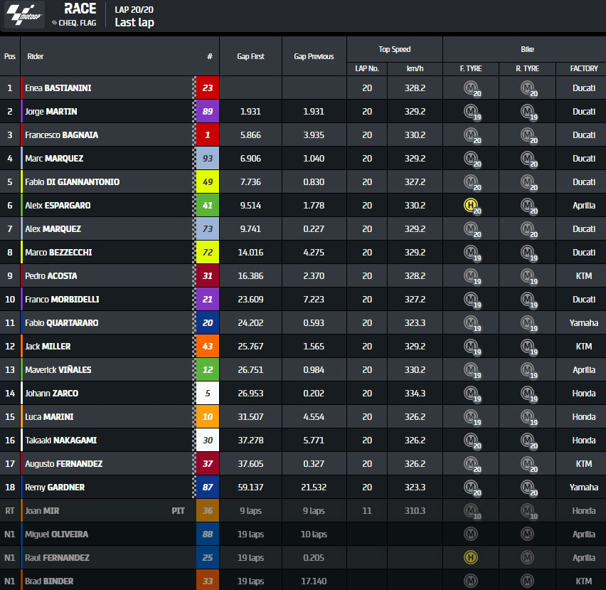 | Sprint | Alex Marquez Bezzecchi Vinales (Voir ici) | Bastianini, Martin, Espargaro (Voir ici) |