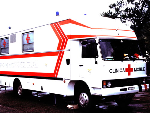 À cette époque, la clinique n’était guère plus qu’une camionnette adaptée avec une civière, des instruments et des ustensiles très basiques. À peine quatre ans plus tard, lors de la saison 1981, avec l’aide de la Fédération Italienne de Moto, elle était déjà devenue un camion avec deux lits et un équipement visiblement plus complet.