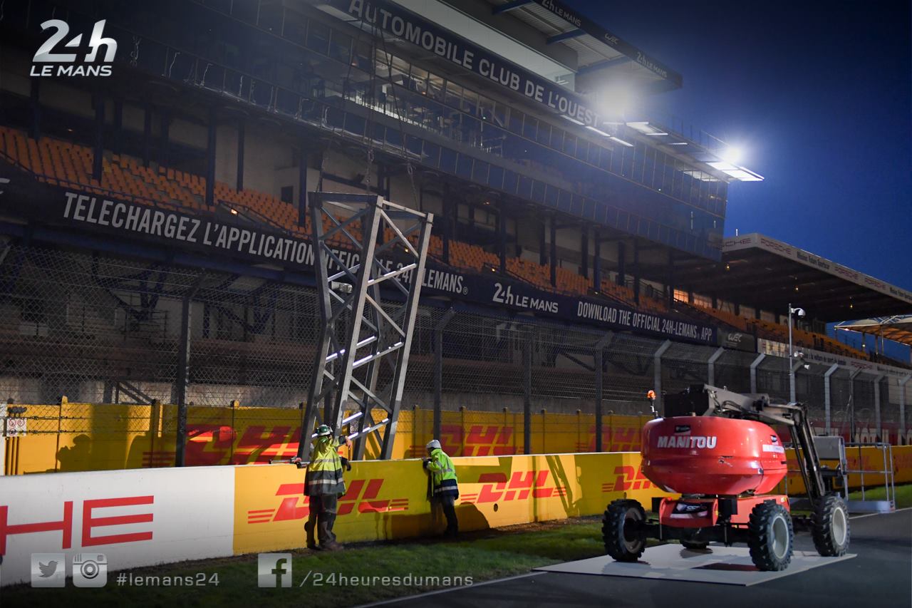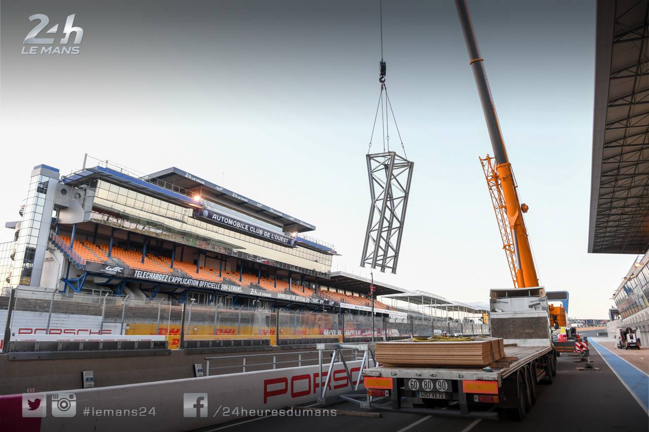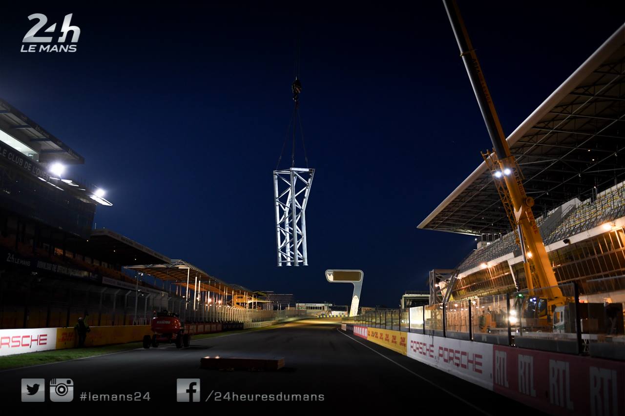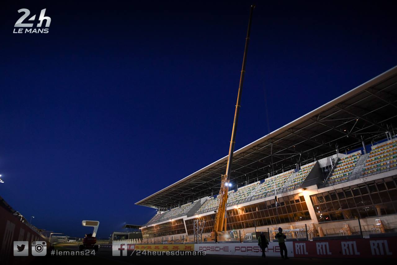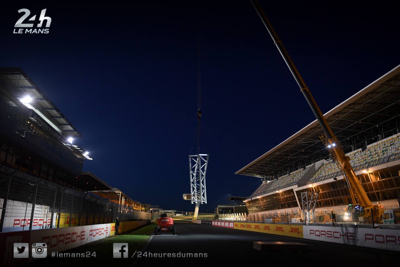 Les travaux ont débuté avant-hier soir avec l’installation du portique support des feux de départ. Celui-ci se trouve désormais au milieu de la ligne droite des stands.
