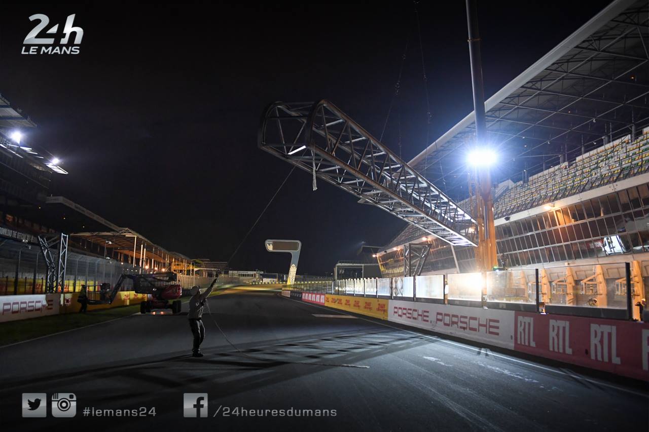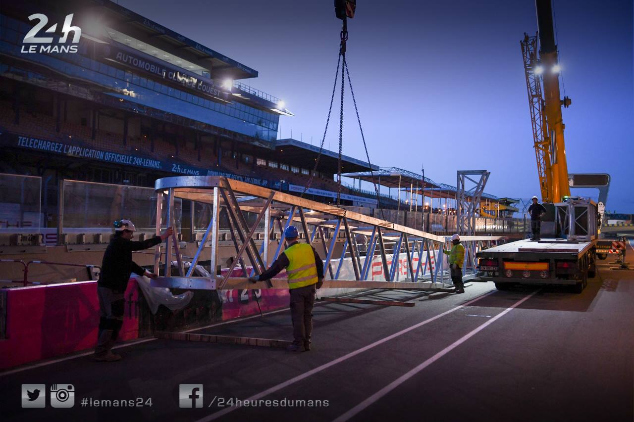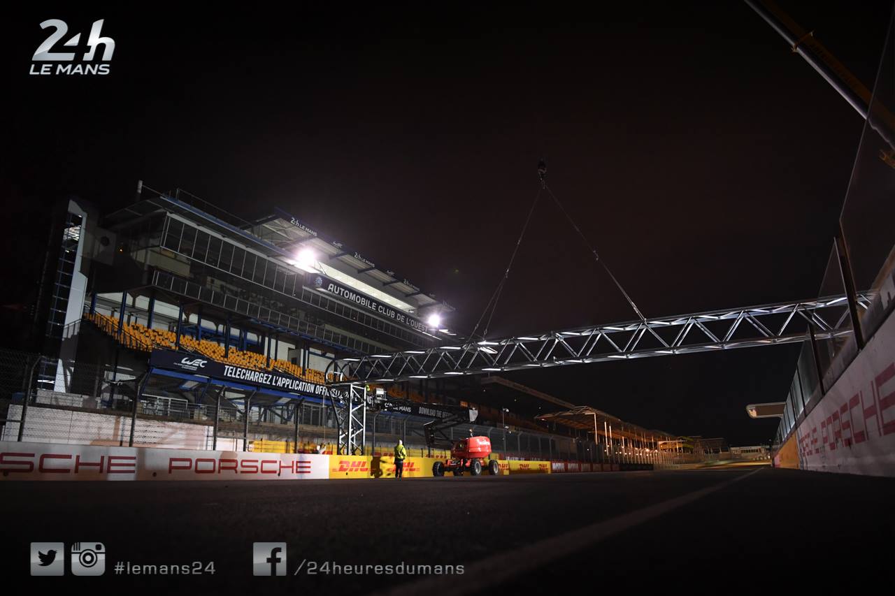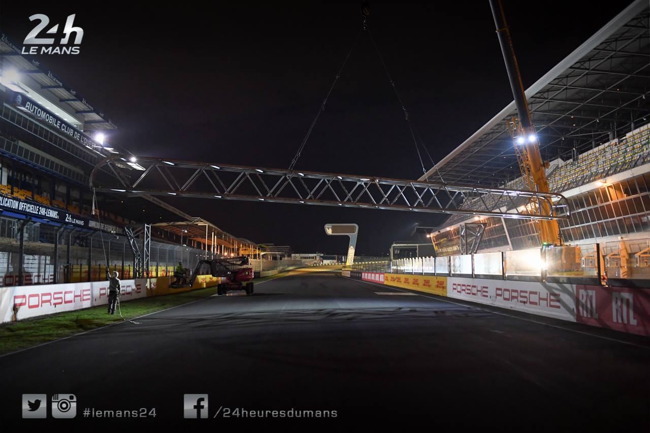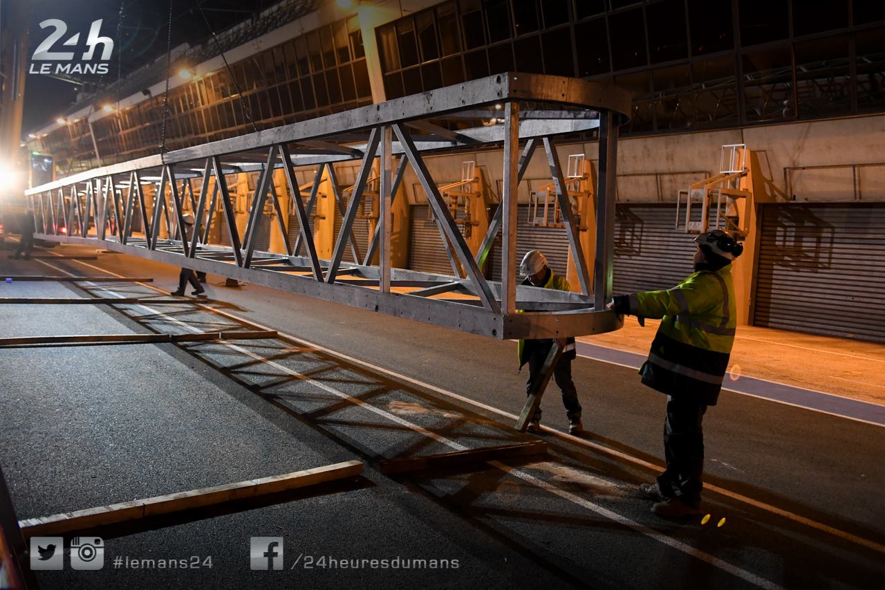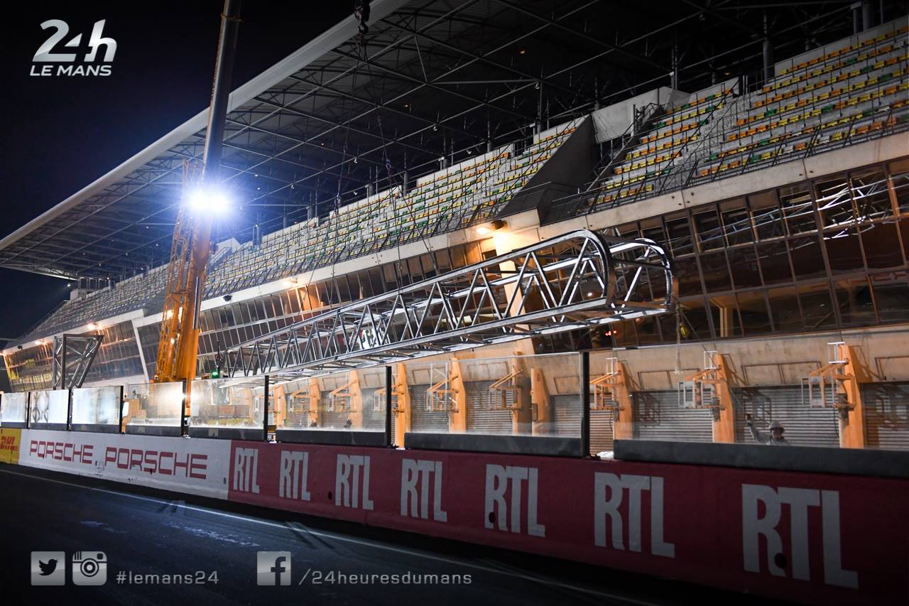 Les travaux ont débuté avant-hier soir avec l’installation du portique support des feux de départ. Celui-ci se trouve désormais au milieu de la ligne droite des stands.