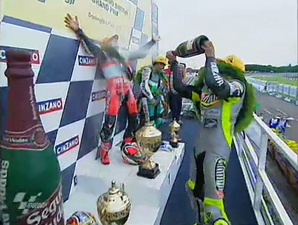 Cet enchaînement de deux courses montrait bien que tu pouvais être dans le noir total ou dans la lumière absolue pour vraiment pas grand-chose. Sur le coup, on l’avait mal encaissé mais cette fin était géniale. Lui était totalement exubérant, je me souviens qu’il chantait, qu’il sautait, qu’il dansait et était complètement heureux après Donington. Et cette phrase la, il l’a répétée plusieurs fois, et comme elle correspond pile-poil à la compétition moto, je l’utilise très souvent, car dans la vie en général et dans notre sport en particulier, ça arrive vraiment souvent.