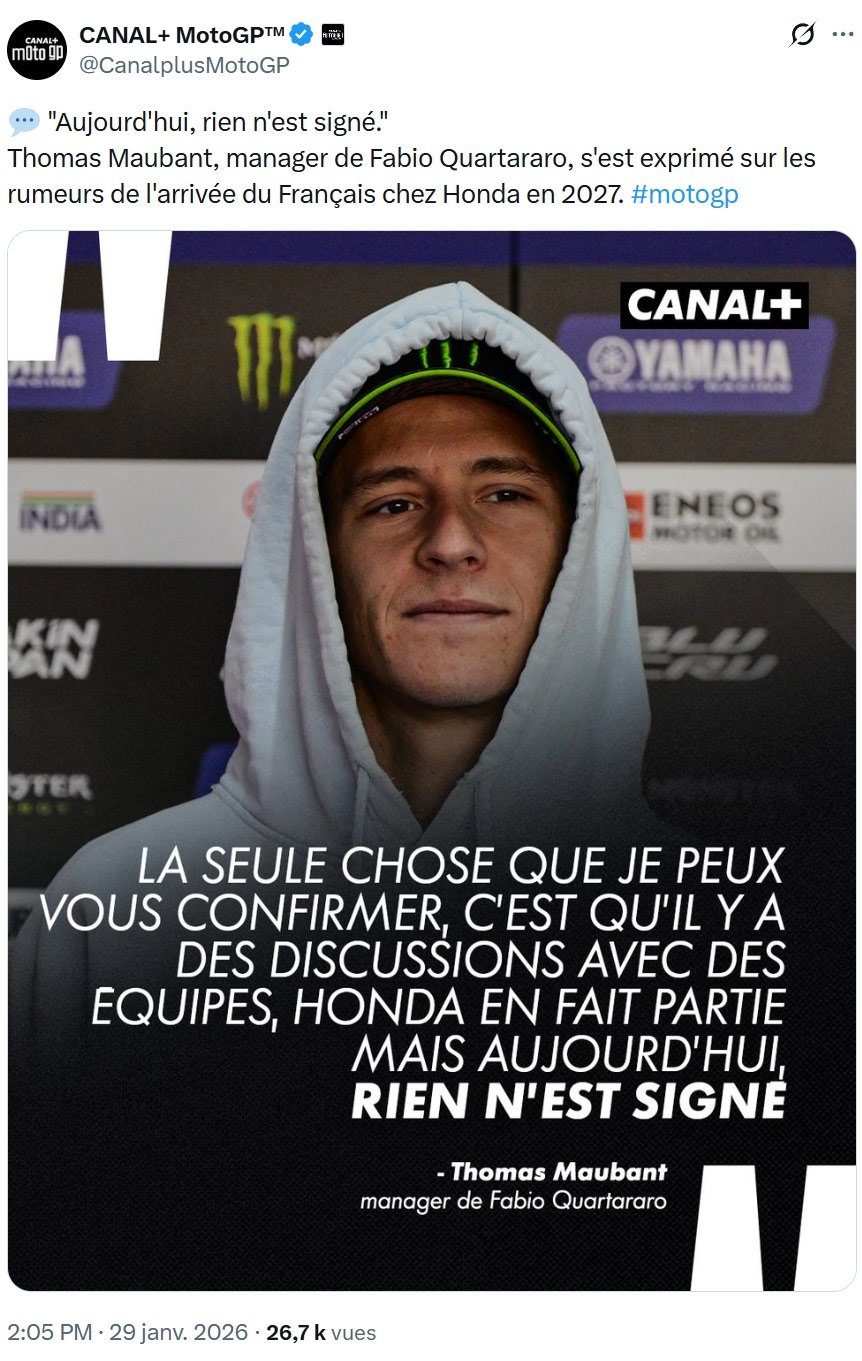 L'information non confirmée du départ de Fabio Quartararo vers Honda en 2027 a fait l'effet d'un coup de tonnerre dans le paddock MotoGP !